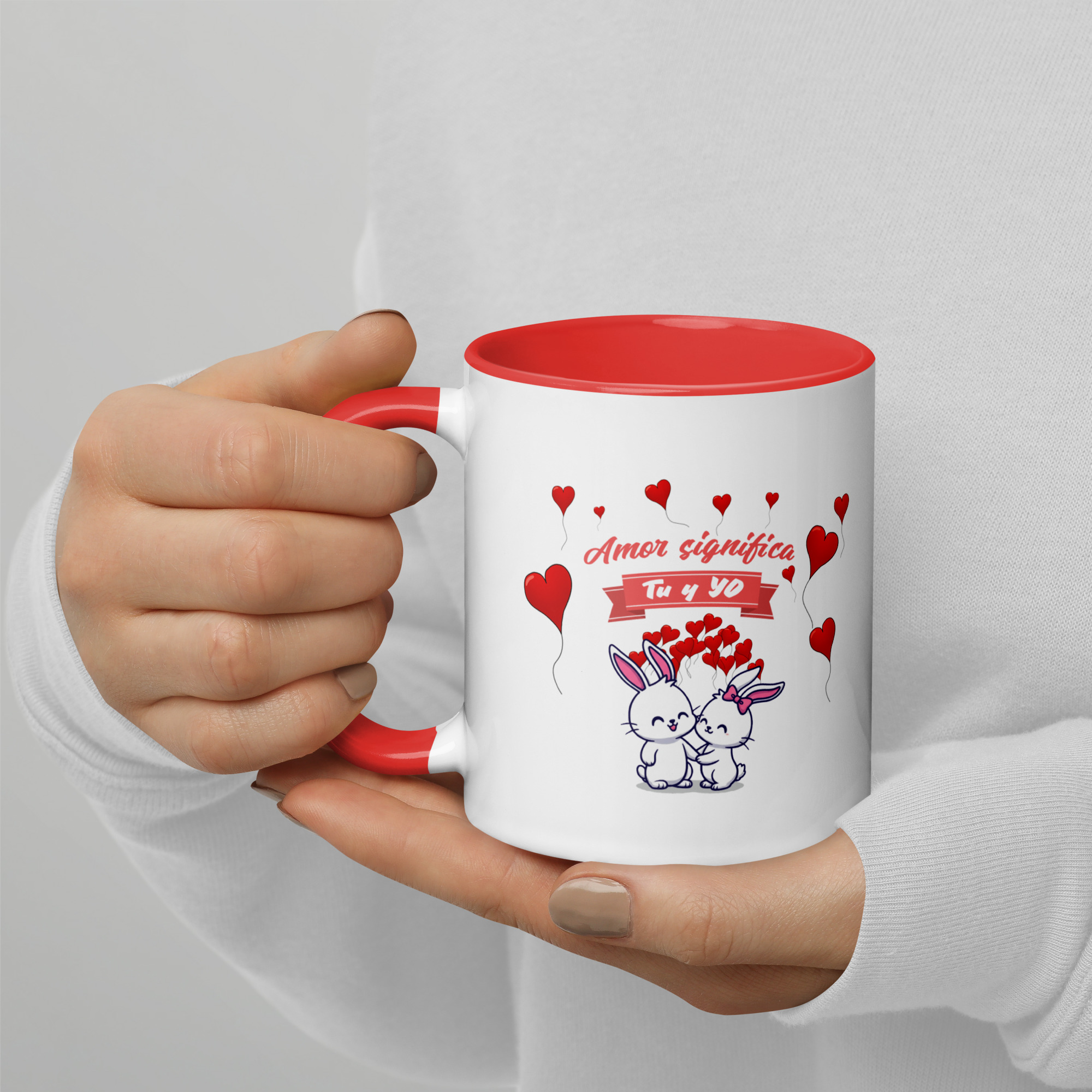 This charming ceramic mug features two sweet bunnies holding heart-shaped balloons, with the gentle message: “Amor significa… Tú y Yo” — because love is simple, tender, and meant to be shared.